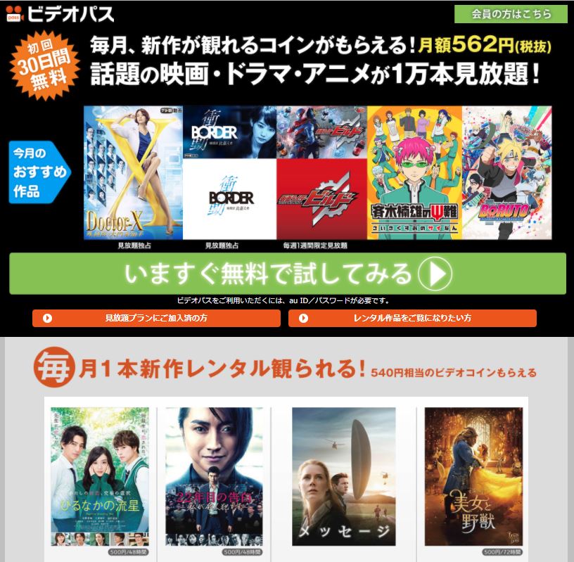 ビデオパスの作品数は10000本でdTVの120万本に比べると少ないですが、毎月540円相当のビデオコインがもらえることを考えると、月額562円は実質無料と言っていいのではないでしょうか。